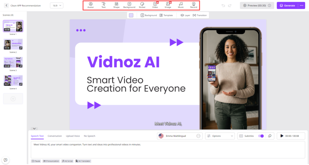 - AI Video Wizard: No editing experience required? Yes, with Vidnoz AI, users can generate high-quality videos with a simple text prompt or any source material. No professional help or expensive studio is required.